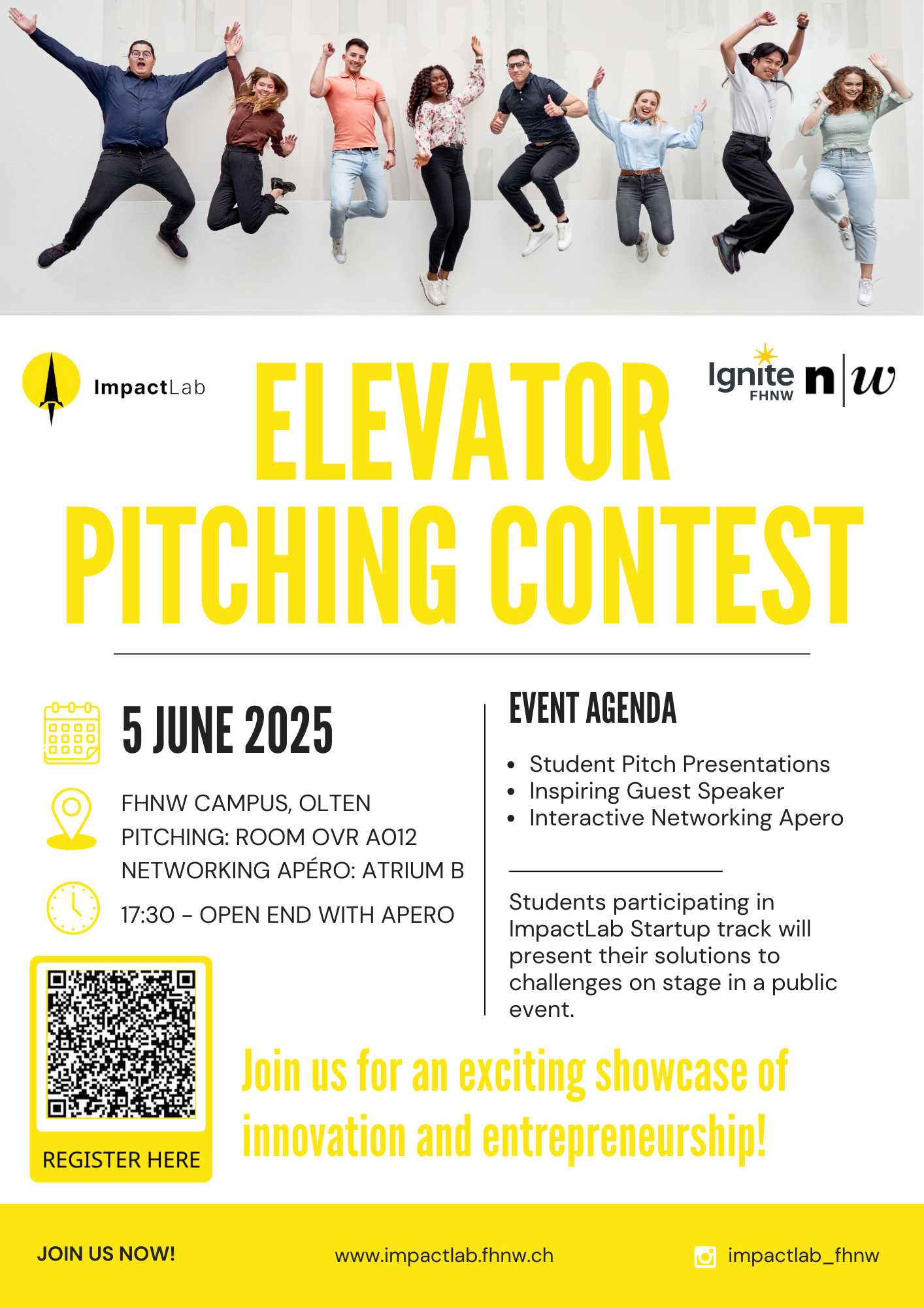 Join us for a high-energy evening as student innovators from FHNW’s ImpactLab take the stage to present their bold ideas and real-world solutions in front of a live audience, expert jury, and potential investors. Whether you’re a supporter of young talent, a curious innovator, or a future founder yourself, this is an event you won’t want to miss.